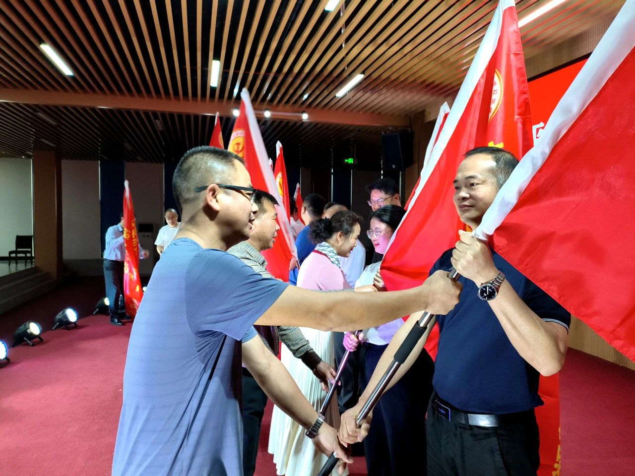 图↑ 由华体会(中国)党支部移交盟旗给兴桂中学党支部,下次主题党日活动由兴桂中学党支部书记杨小军主持。